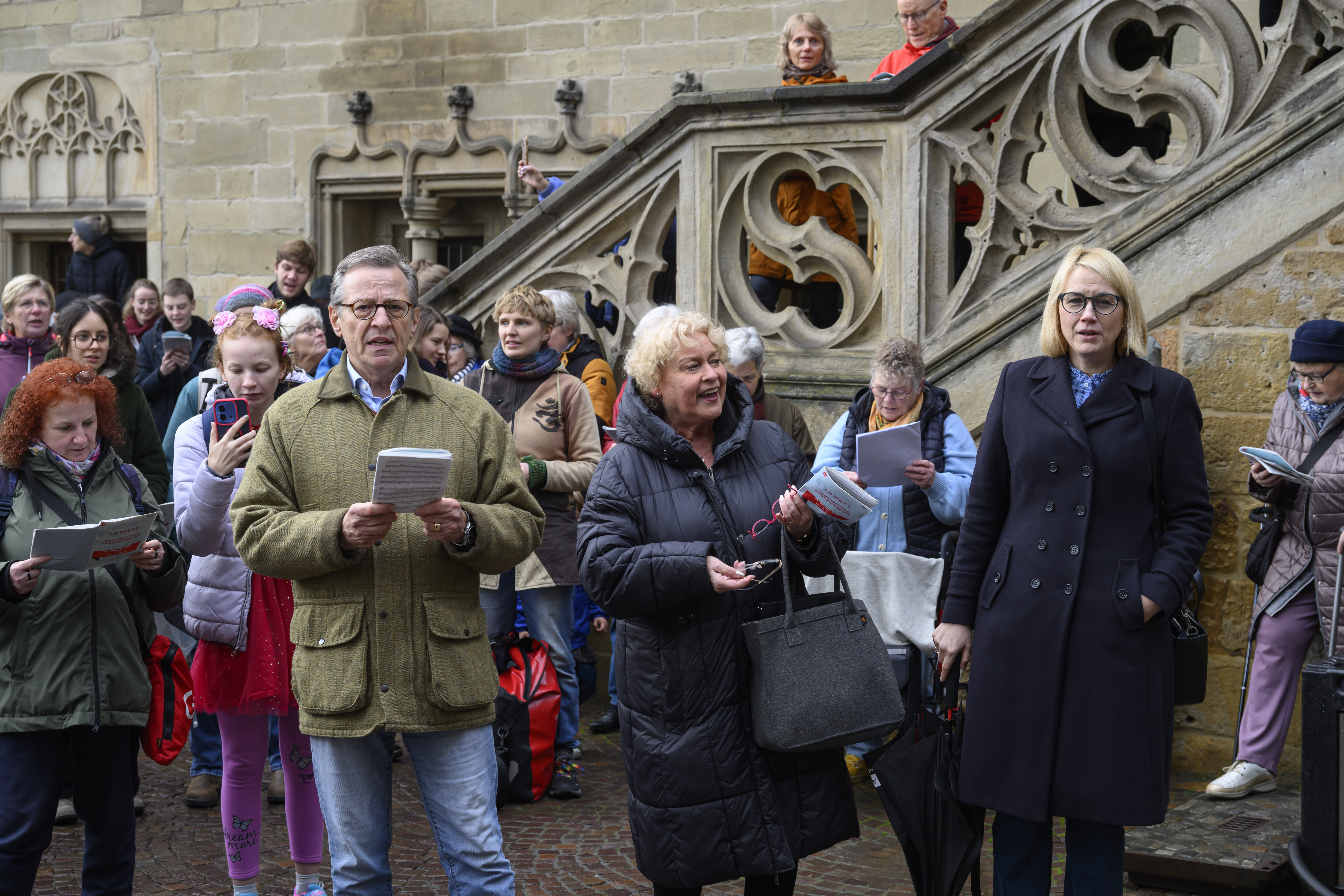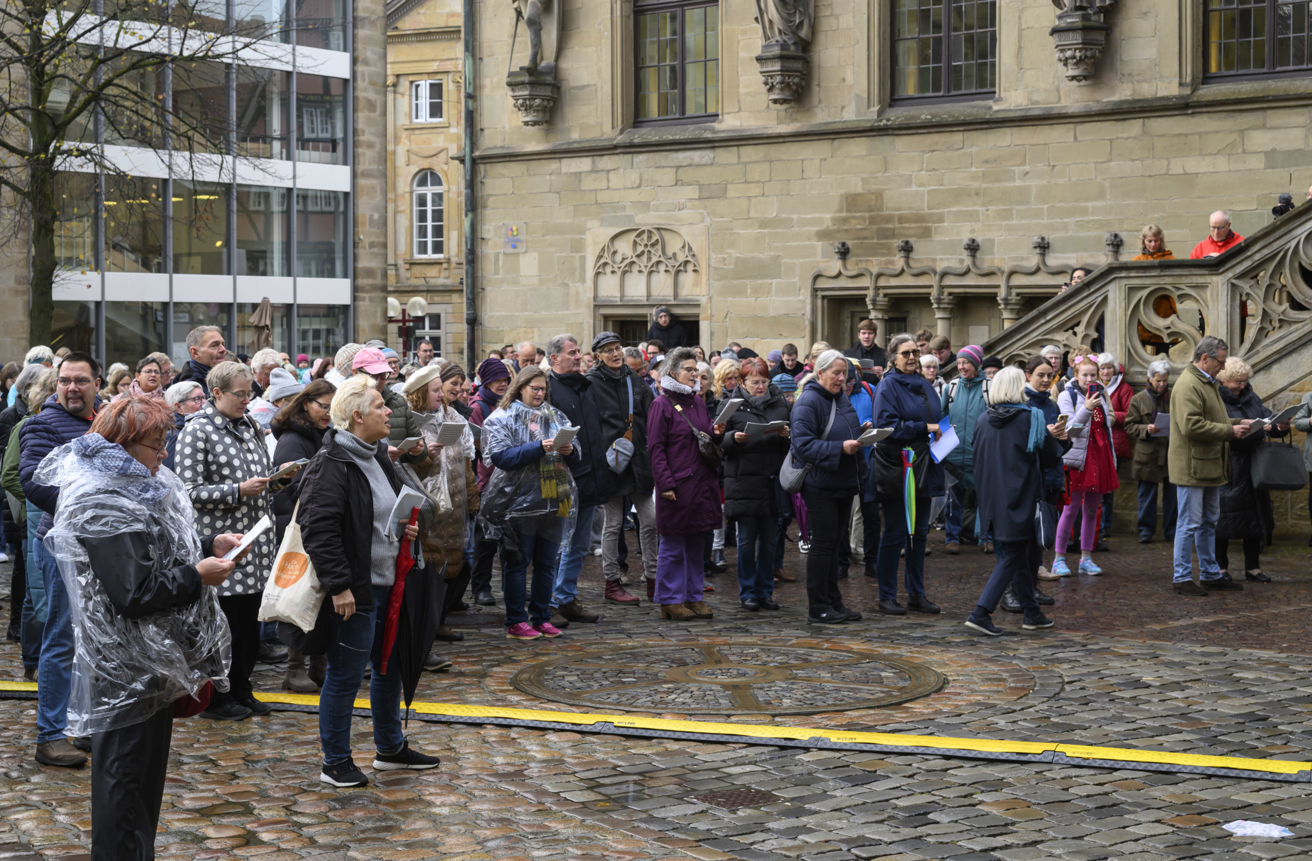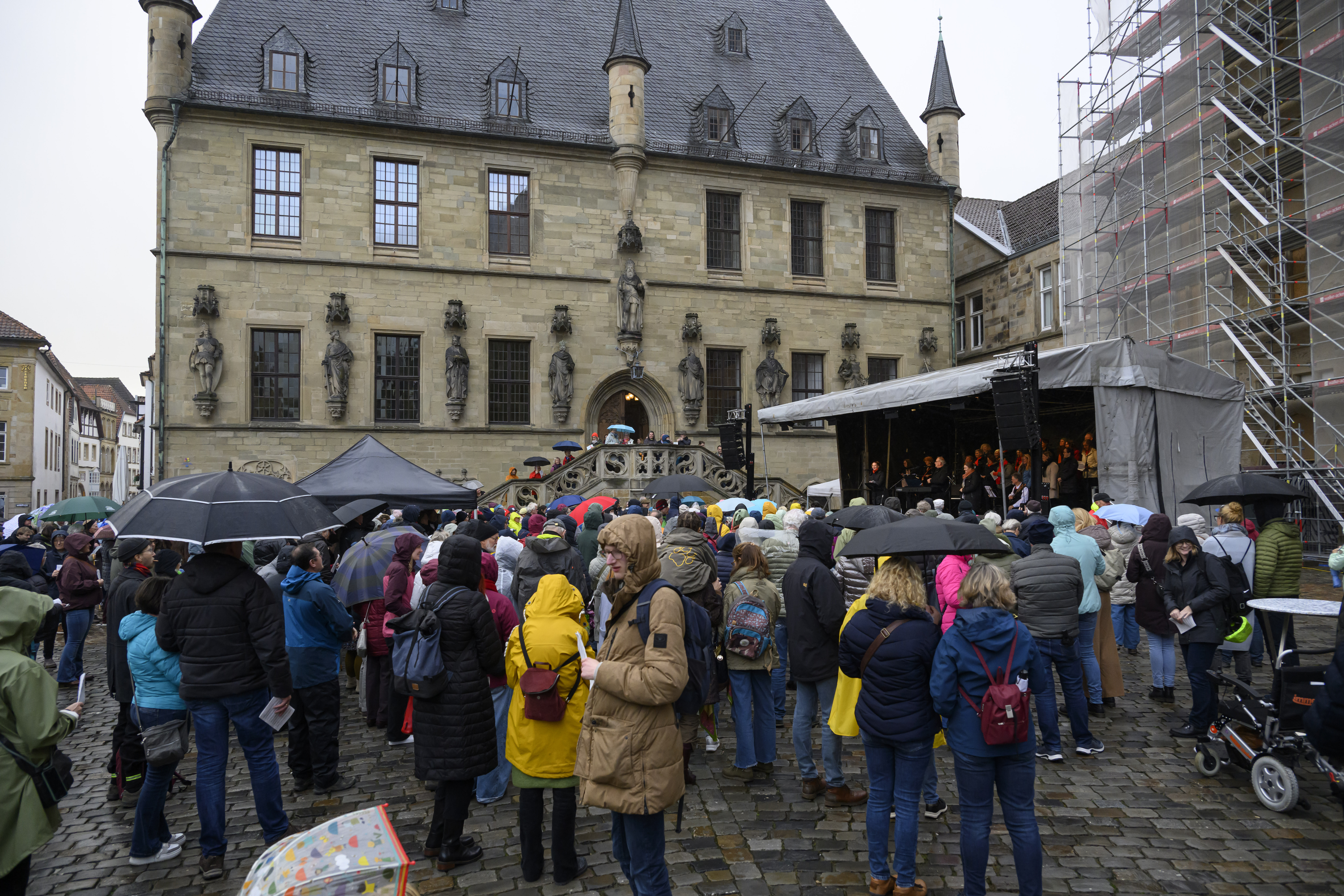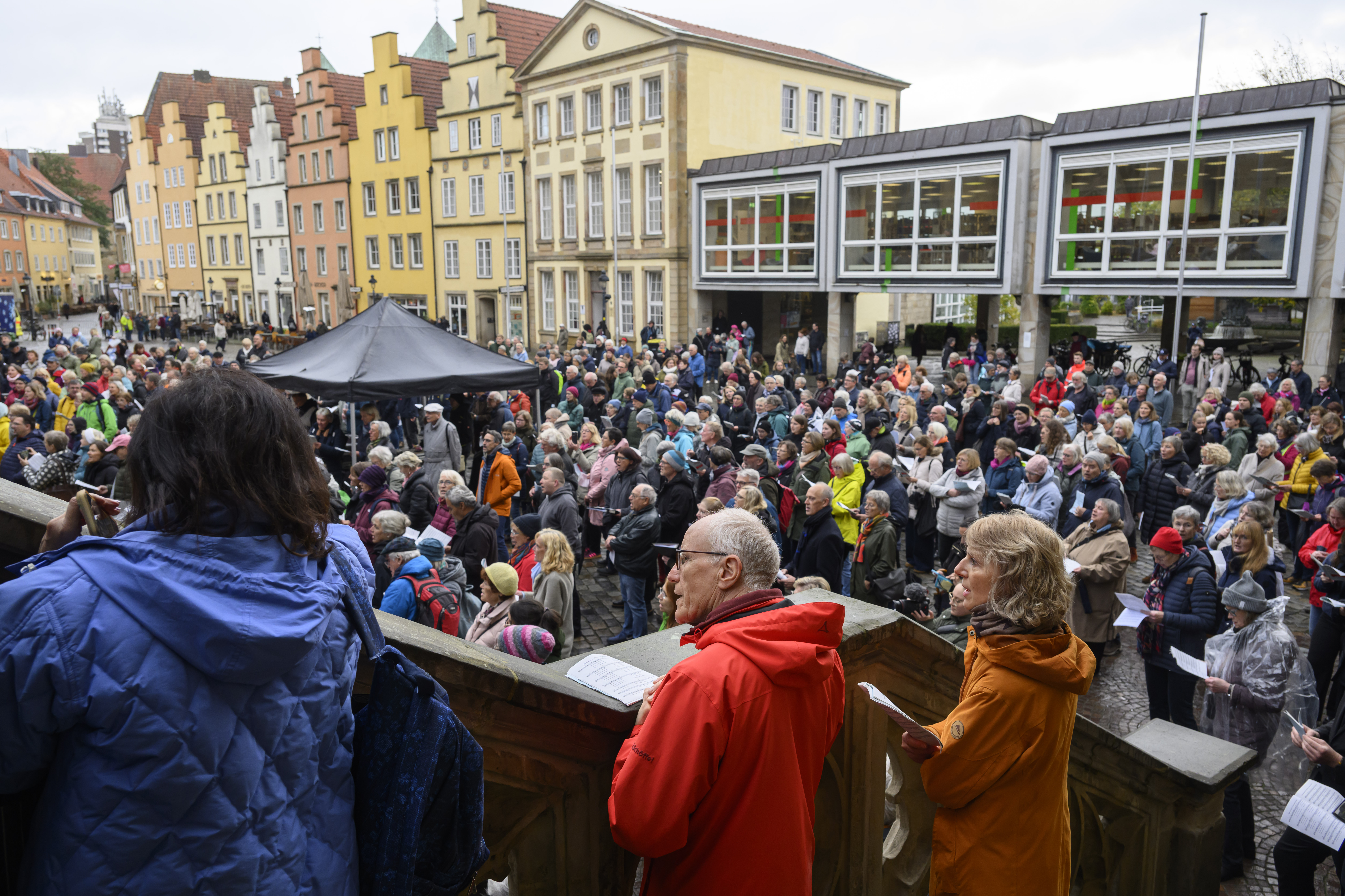 Das Friedenssingen in Osnabrück verbindet Musik, Gemeinschaft und Erinnerung auf besondere Weise. Erstmals fand es im Rahmen des Jubiläums zum Westfälischen Frieden 2023 statt: Mit einem vielstimmigen Chor erinnerte die Stadt an den Tag, an dem vor 375 Jahren der Dreißigjährige Krieg endete. Nachdem der Friedensvertrag am 24. Oktober 1648 in Münster unterzeichnet worden war, brachte ein Friedensbote die Nachricht nach Osnabrück, wo sie am 25. Oktober von der Rathaustreppe aus verkündet wurde. Vor Freude fingen die Menschen damals spontan an zu singen – dieses historische Bild wurde beim Jubiläums-Friedenssingen 2023 wieder lebendig: Über 2.000 Menschen fanden sich auf dem Marktplatz ein, sangen gemeinsam und feierten den Friedensschluss.
